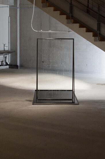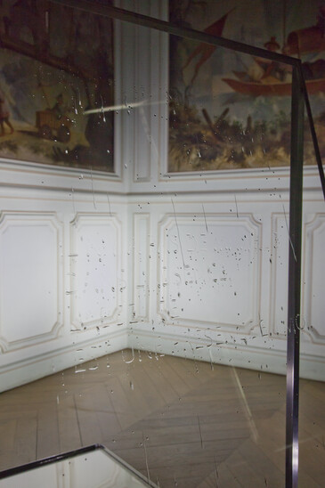 Des gouttes d'eau tombent sur une stèle de verre. Elles ne semblent pas se diriger au hasard, elles prennent des chemins de traverse, épousent les tracés invisibles et forment des lettres ou morceaux de lettres ; elles laissent entrevoir des mots, une phrase*, l’épitaphe d’un penseur, Félix Guattari.
